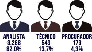 Ademais, havia 549 Técnicos (13,7% do total) e 173 Procuradores (4,3% do total).