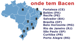 Além da capital federal, o Bacen está presente em: Belém (PA), Belo Horizonte (BH), Curitiba (PR), Fortaleza (CE), Porto Alegre (RS), Recife (PE), Rio de Janeiro (RJ), Salvador (BA) e São Paulo (SP).