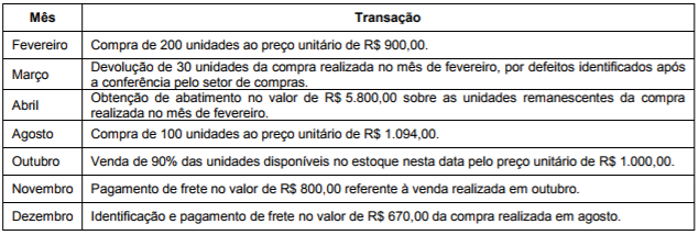 46. Uma empresa adota o método da média ponderada móvel para avaliação do estoque do único produto que comercializa e não incide qualquer tributo na compra e na venda. Em 02/01/2016, o estoque era composto de 400 unidades registradas pelo valor de R$ 400.000,00. As transações relacionadas com a compra e venda do produto no ano de 2016 são apresentadas abaixo, em ordem cronológica: