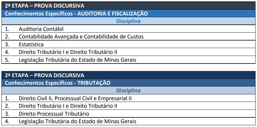 A Prova Discursiva da SEFAZ/MG valerá 80 pontos e será constituída de 4 (quatro) questões discursivas, valendo 20 pontos cada, baseadas no conteúdo programático de conhecimentos específicos: