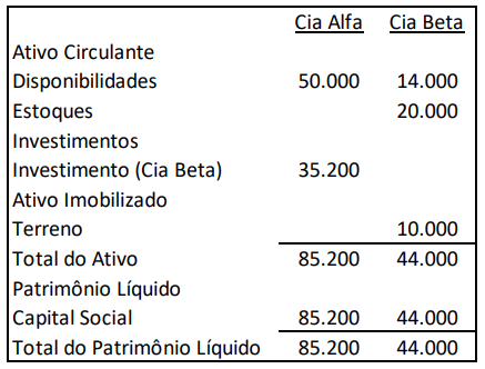 Em 31/12/X0, as Cias Alfa e Beta apresentavam os seguintes balanços patrimoniais: