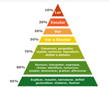 A ideia é a seguinte: devido ao fato de que a discursiva conter matérias de conhecimento específico, escrever uma discursiva será uma preparação concomitante para a prova objetiva também. Inclusive, a pirâmide de aprendizado mostra que escrever e explicar o conteúdo garante uma absorção de até 95% do conteúdo. Veja: