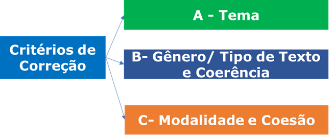 Quanto aos critérios avaliativos, a VUNESP costuma repetir sempre o mesmo estilo de espelho. O espelho de correção (ou Grade de Avaliação) é dividido em três critérios: