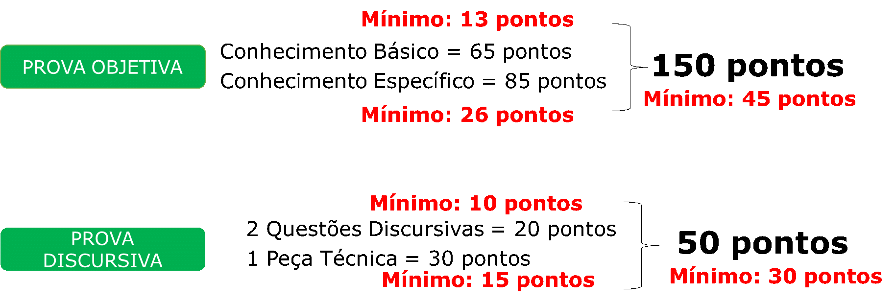 As questões discursivas valem 10 pontos cada, totalizando 20 pontos. Já a peça técnica vale sozinha 30 pontos. Logo, a nota final da prova discursiva é de 50 pontos, sendo aprovado o candidato que conseguir tirar pelo menos 10 pontos no somatório das questões, 15 pontos na peça técnica e 30 pontos na nota total final da prova discursiva.
