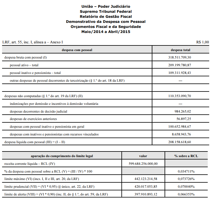Considere que a tabela apresentada abaixo, de caráter hipotético, compõe o Relatório de Gestão Fiscal do Supremo Tribunal Federal (STF) relativo ao 1.º quadrimestre de 2015. O Relatório foi assinado pelo presidente do STF, pelo responsável pela administração financeira e pelo responsável pelo controle interno do órgão e, em obediência ao disposto no art. 55, § 3.º, da Lei de Responsabilidade Fiscal, foi apresentado ao TCU no prazo legal de trinta dias após o encerramento do período a que se refere, embora não tenha havido publicação eletrônica. Considere, ainda, que todas as informações adicionais (como relatório da dívida consolidada, concessão de garantias e operações de crédito) integrantes do referido Relatório de Gestão Fiscal foram também apresentadas e estão regulares.