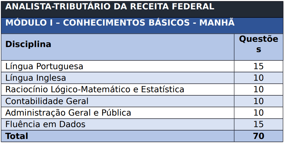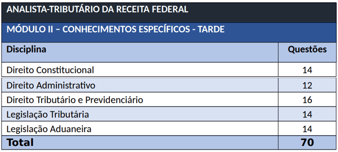 Para o cargo de Analista Tributário serão cobradas as seguintes disciplinas. Ademais, a tabela mostra a quantidade de questões por disciplina.