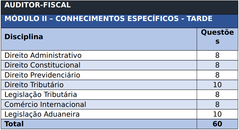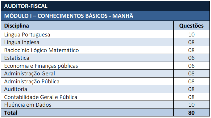 Para o cargo de Auditor Fiscal serão cobradas as seguintes disciplinas. Ademais, a tabela mostra a quantidade de questões por disciplina.