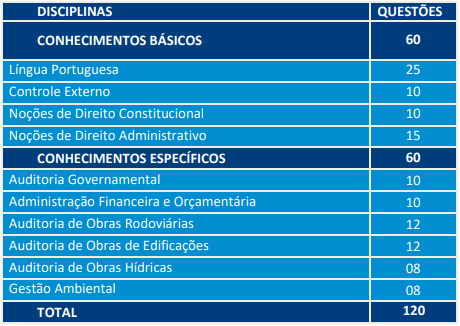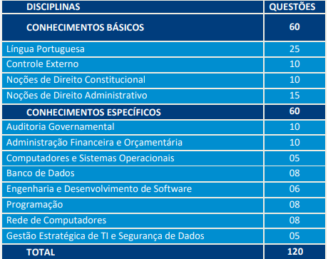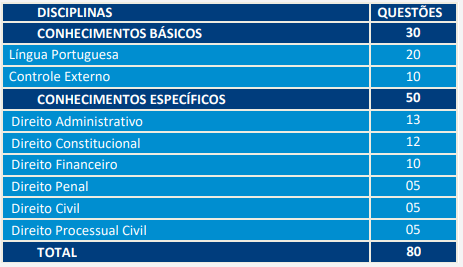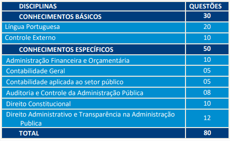 • Prova Discursiva de conhecimentos específicos, composta por 2 questões (eliminatório e classificatório) apenas para as áreas de Auditoria Governamental e Ministério Público de Contas;