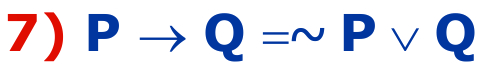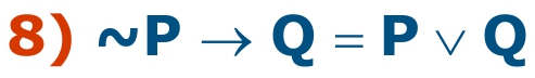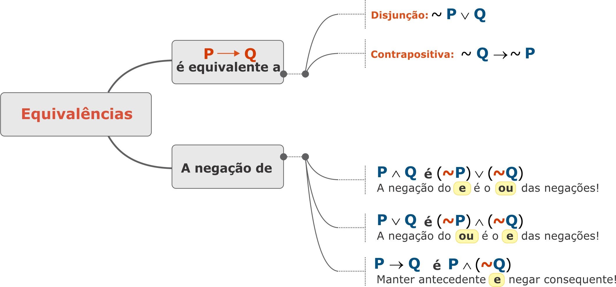 A maior parte das equivalências envolvem a proposição P -> Q, chamada de condicional na qual P e Q são, respectivamente, o antecedente e o consequente. Nomes a parte, a primeira equivalência diz respeito à transformação da condicional em uma disjunção: