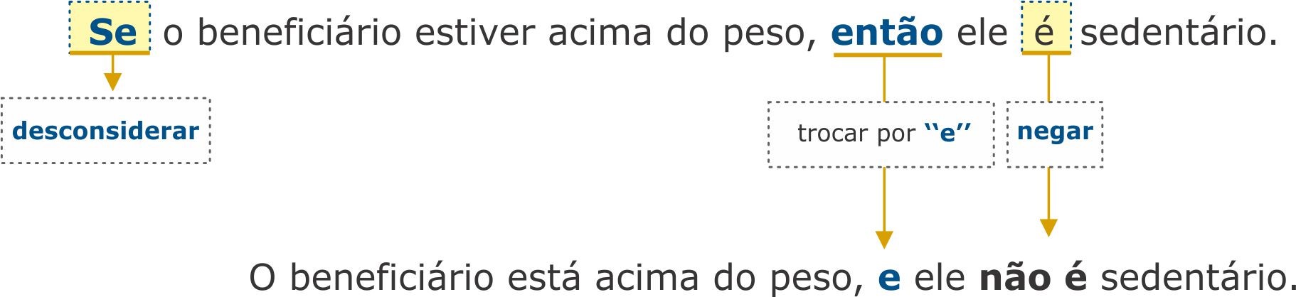 A negação da proposição procurada envolve em partir do mesmo ponto (o beneficiário estiver acima do peso) e chegar a resultado diverso do inicialmente considerado (ele não é sedentário).