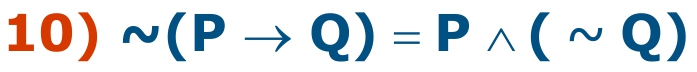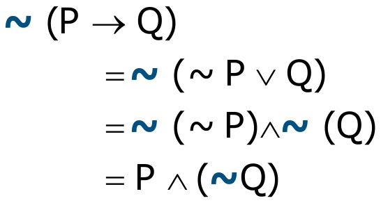 Para encerrar nossa sequência de propriedades e equivalências, vamos deduzir a negação da proposição condicional usando mecanismo mais “algébrico”. Para tal, substituímos P -> Q = ~P ou Q para, a seguir, usar a relação de De Morgan: