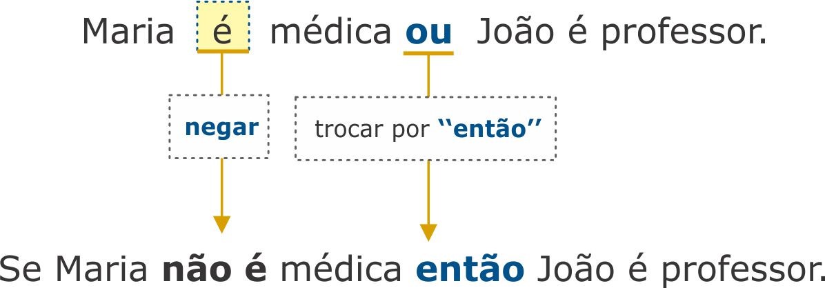 Então o equivalente de “José é funcionário público ou Maria é empresária do ramo de roupas” vai ser “Se José não é funcionário público, então a Maria é empresária do ramo de roupas” ou “Se Maria não é empresária do ramo de roupas, então José é funcionário público”.