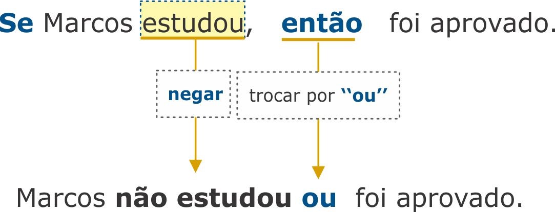 Em “Se Marcos estudou, então foi aprovado”, antecedente e consequente são, respectivamente, dados dos “Marcos estudou” e “foi aprovado”. Para identificar a proposição equivalente, desconsideramos o “se”, negamos o antecedente, trocamos o “então” pelo “ou” e, por fim, mantemos o consequente: