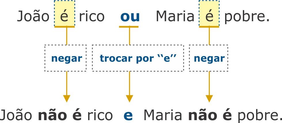 Leia assim: “A negação da conjunção ~(P e Q) é equivalente à disjunção das negações (~P) ou (~Q)”. Vejam uma questão que explora essa equivalência lógica: