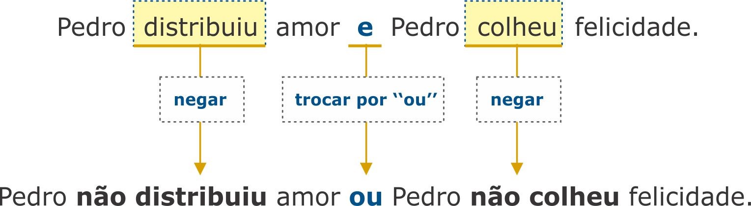Questão clássica na qual buscamos proposição equivalente para a negação para “Pedro distribuiu amor e Pedro colheu felicidade”. Para negá-la, trocamos o conectivo por “ou” e negamos as proposições “Pedro distribuiu amor” e “Pedro colheu felicidade”. Vejam como fica:
