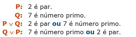 Para a disjunção, o paralelo que costumo traçar está relacionado à adição de números naturais. Da mesma forma que a ordem dos fatores não altera a adição (resultado da soma), a ordem das proposições P e Q não altera a tabela-verdade da proposição P ou Q. Veja que, mesmo alterando a ordem das proposições P e Q seguinte, a mensagem não tem significado modificado.