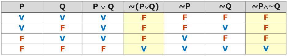 Leia assim: “A negação da disjunção ~(P Ú Q) é equivalente à disjunção das negações (~Q) Ù (~Q)”. Bem parecida com a anterior…