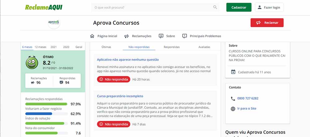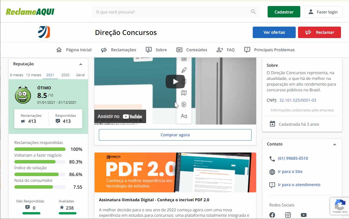 Nota no Reclame Aqui: o Reclame Aqui é um site que recebe reclamações de consumidores sobre produtos e serviços comprados e avalia (a) o tempo de resposta da empresa em relação às solicitações, (b) a quantidade de questões resolvidas e (c) o feedback do consumidor sobre fazer negócios novamente com a empresa ou não. É uma ótima referência para conhecer a reputação das empresas.