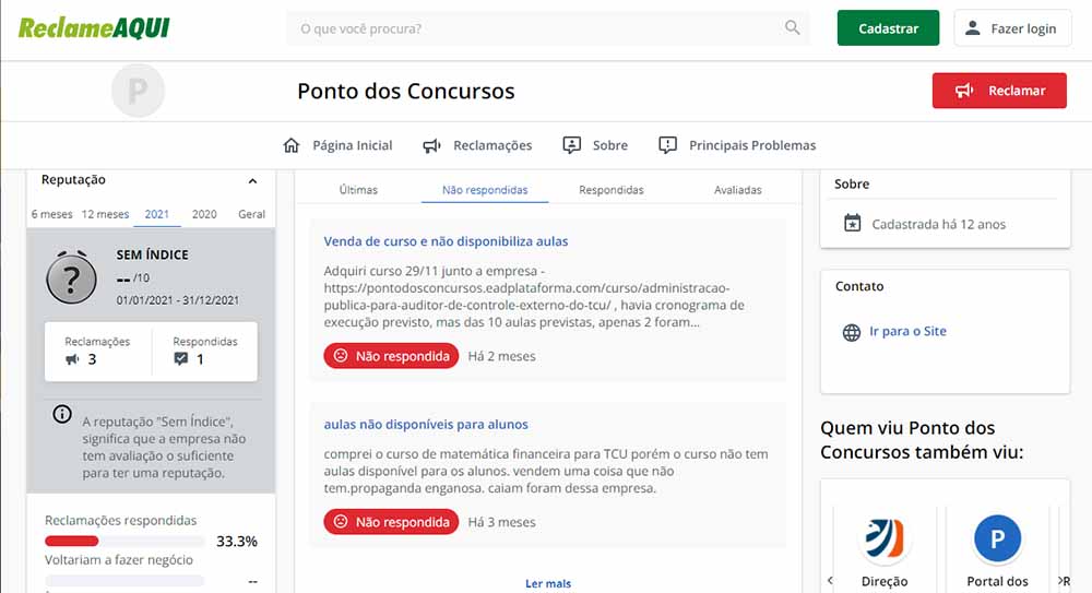 - Não possui nota no Reclame Aqui, mas respondeu 1 de 3 reclamações em 2021.