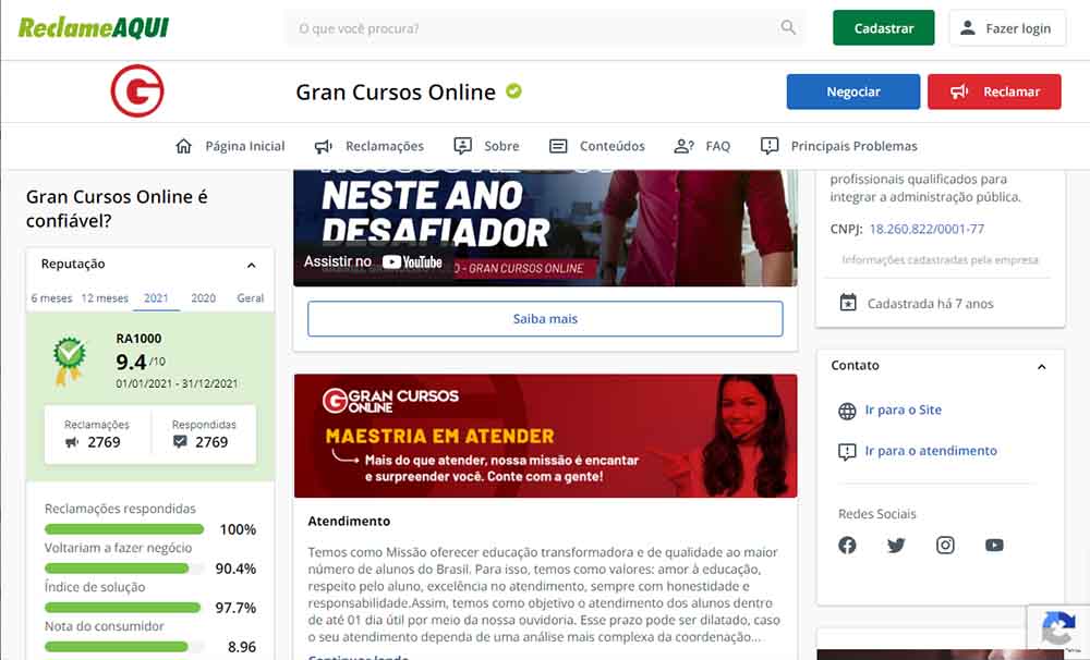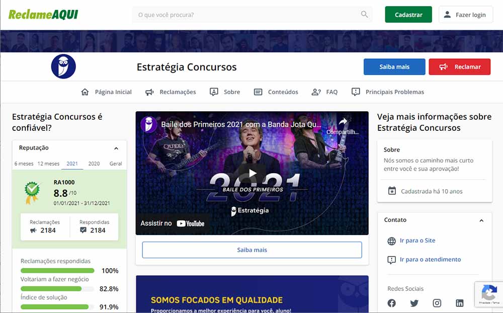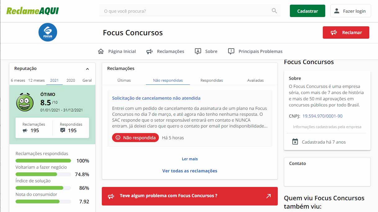 - Nota 8,5 no Reclame Aqui e todas as reclamações respondidas, com 86% de resolução de problemas. Além disso, 74,8% dos consumidores indicou que voltaria a fazer negócios com a empresa.