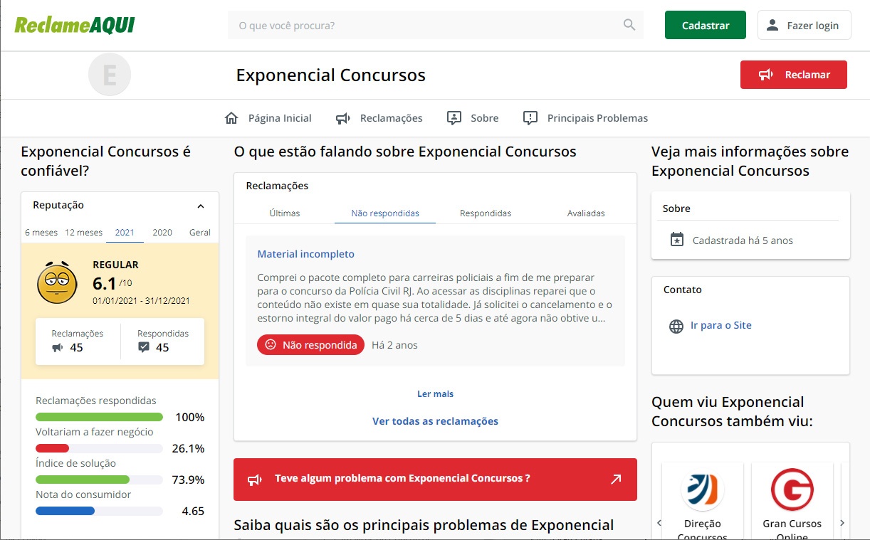 - Nota 6,1 no Reclame Aqui, com 100% das solicitações de clientes respondidas e 73,9% de resolução de problemas. Além disso, apenas 26,1% dos consumidores indicou que voltaria a fazer negócios com a empresa.
