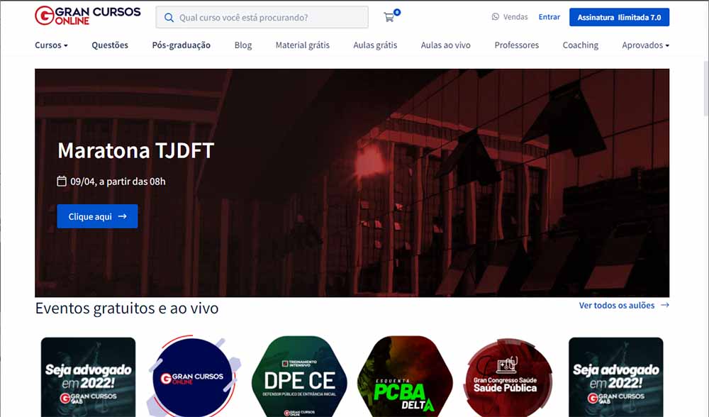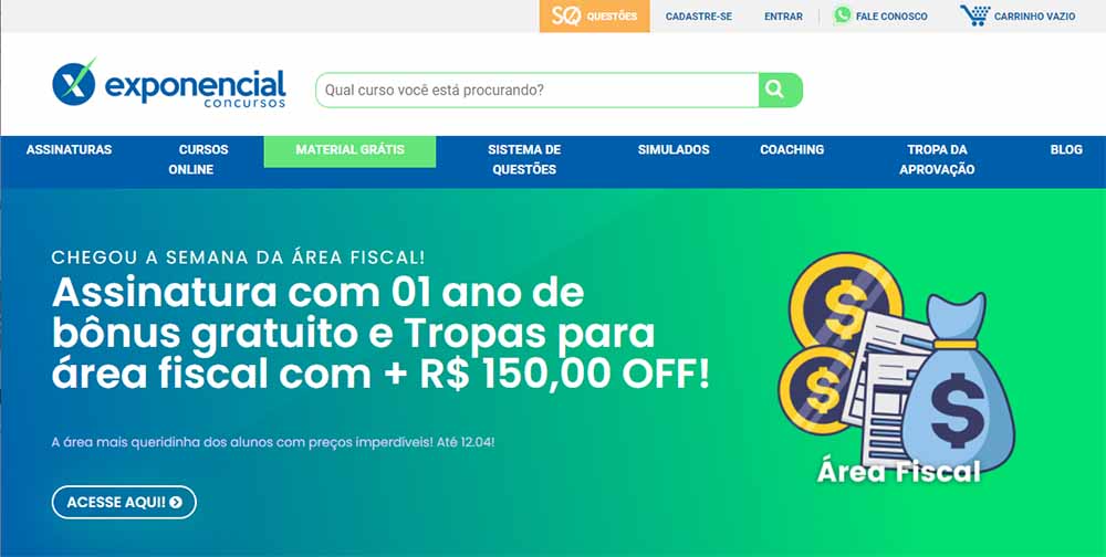 - Para quem quer conhecer mais do curso antes de comprar o pacote, oferece vários conteúdos gratuitos, como aulas, apostilas, questões e simulados.