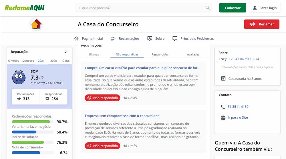 - Nota 7,3 no Reclame Aqui, com 90,7% das solicitações de clientes respondidas, 76,3% de resolução de problemas. Além disso, apenas 58,4% dos consumidores indicou que voltaria a fazer negócios com a empresa.