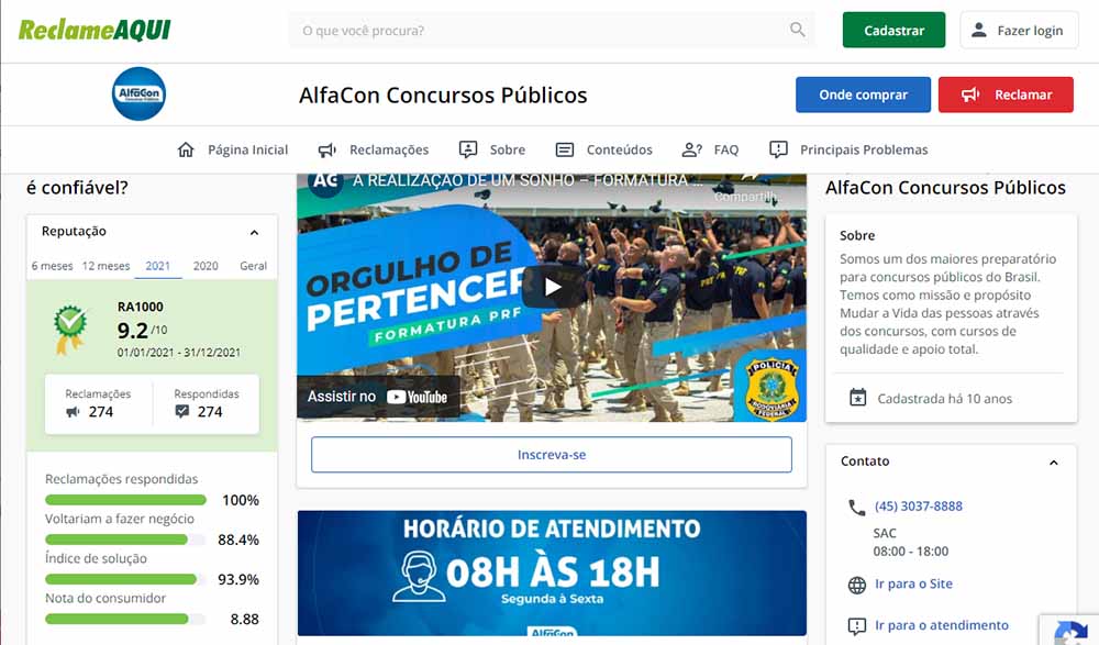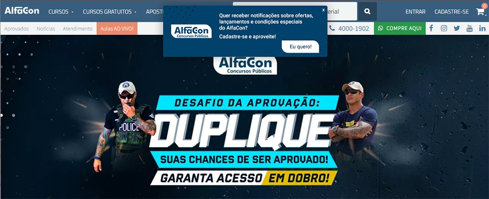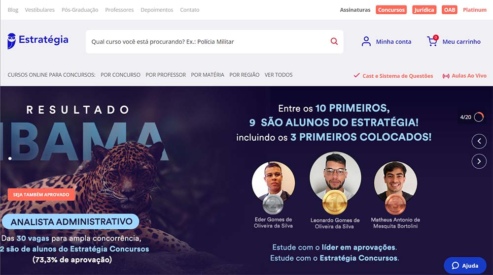 - Possui depoimentos em vídeo e texto de ex-alunos do curso e informações sobre quantidade de alunos aprovados em concursos.