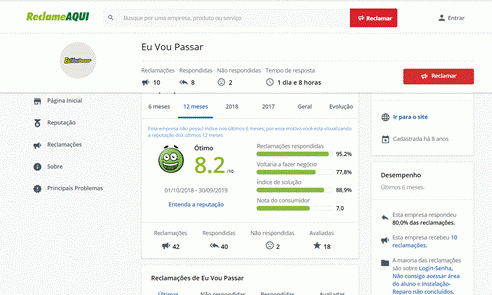 - Nota 8,1 no Reclame Aqui, todas as solicitações de clientes respondidas, com 87,8% de resolução de problemas. Além disso, 66% dos consumidores indicou que voltaria a fazer negócios com a empresa.