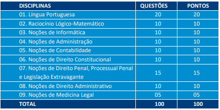 Para os cargos de Agente e Escrivão, o quadro a seguir apresenta as disciplinas e o número de questões: