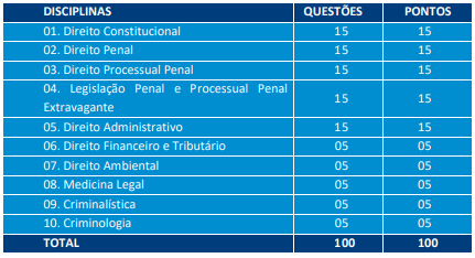 Para o cargo de Delegado, o quadro a seguir apresenta as disciplinas e o número de questões: