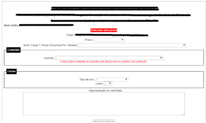 b) Os recursos de forma são separados por “tipo de erro” e “linha”. Basta indicar o nome do erro e a linha (já destacados na sua proposta de recurso) dentro da área “forma”, inserir o recurso na aba “argumentação do candidato” e depois clicar em “gravar”. O Cebraspe vai levar você para a página inicial e, então, é só repetir o passo a passo. Cara erro deve possuir um recurso específico.