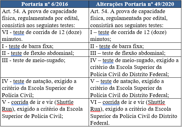 Dentre várias mudanças previstas na Portaria PCDF nº 49/2020, consta a alteração do art. 54 do Anexo à Portaria PCDF nº 06/2016, que trata acerca da prova de capacidade física, vejamos: