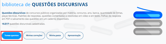 E você navega facilmente com os filtros por banca, matéria, assunto, área, órgão, ano, nível de escolaridade, além das exclusivas seleções por quantidade de linhas, questões inéditas, com padrão de resposta, com resolução em texto e em vídeo.