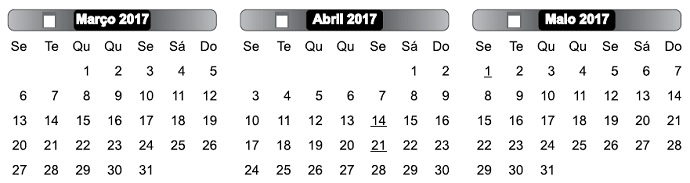 Feriados: 14.04 – Sexta-Feira Santa; 21.04 – Tiradentes; 01.05 – Dia do Trabalho