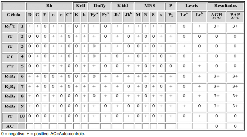 Resultados dos testes pré-transfusionais:Grupo Sanguíneo = A RhD = Negativo – Pesquisa de Anticorpos Irregulares (LISS-AGH) – Gel teste = Positivo com as duas células de triagem na técnica da antiglobulina humana. Foi realizado um painel de identificação de anticorpos e os resultado está apresentado no quadro abaixo: