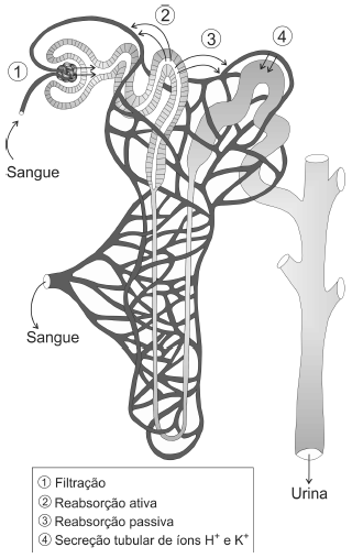 Logo após a realização de provas esportivas, parte da rotina dos atletas inclui a ingestão de água e de bebidas isotônicas; também é feita a coleta de urina para exames antidoping, em que são detectados medicamentos e drogas, eventualmente ingeridos, que o corpo descarta. As bebidas isotônicas contêm água, glicose e sais minerais, apresentando concentração iônica semelhante à encontrada no sangue humano. No esquema ao lado, os números de 1 a 4 indicam processos, que ocorrem em um néfron do rim humano.