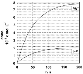 a) Para os tempos indicados na tabela da folha de respostas, complete a tabela com as concentrações de i-P e PA.