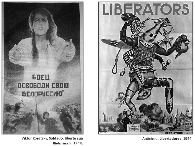 As duas imagens acima foram divulgadas durante a Segunda Guerra Mundial, respectivamente, na União Soviética e na Alemanha.