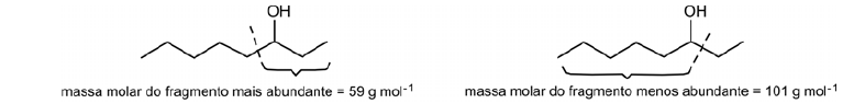 Quando álcoois secundários são analisados por espectrometria de massas, resultam várias quebras de ligações, sendo a principal a que ocorre entre o átomo de carbono ligado ao grupo OH e o átomo de carbono vizinho. Para o 3-octanol, por exemplo, há duas possibilidades para essa quebra, como mostrado abaixo. Forma-se, em maior abundância, o fragmento no qual o grupo OH está ligado à cadeia carbônica mais curta.