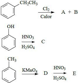 Apresente os respectivos produtos (A, B, C, D e E) das reações químicas representadas pelas seguintes equações:
