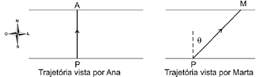 Pedro atravessa a nado, com velocidade constante, um rio de 60 m de largura e margens paralelas, em 2 minutos. Ana, que boia no rio e está parada em relação à água, observa Pedro, nadando no sentido sul-norte, em uma trajetória retilínea, perpendicular às margens. Marta, sentada na margem do rio, vê que Pedro se move no sentido sudoeste-nordeste, em uma trajetória que forma um ângulo θ com a linha perpendicular às margens. As trajetórias, como observadas por Ana e por Marta, estão indicadas nas figuras abaixo, respectivamente por PA e PM. Se o ângulo θ for tal que cos θ = 3/5 (sen θ = 4/5), qual o valor do módulo da velocidade
