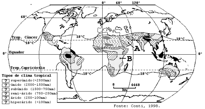 a) Identifique as áreas A e B quanto à sua localização geográfica e seus respectivos tipos climáticos, utilizando a legenda parcial do mapa.