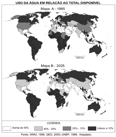 b) Analise o Mapa B, considerando o uso da água em relação ao total disponível, para os EUA. Explique, identificando, ao menos, duas razões.