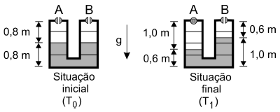 Dois tanques cilíndricos verticais, A e B, de 1,6 m de altura e interligados, estão parcialmente cheios de água e possuem válvulas que estão abertas, como representado na figura para a situação inicial. Os tanques estão a uma temperatura T0 = 280 K e à pressão atmosférica P0. Em uma etapa de um processo industrial, apenas a válvula A é fechada e, em seguida, os tanques são aquecidos a uma temperatura T1, resultando na configuração indicada na figura para a situação final.