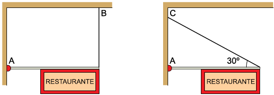 Para montar a fachada de seu restaurante, o proprietário considera duas maneiras diferentes de prender uma placa na entrada, conforme as figuras 1 e 2. Nas duas maneiras, uma mesma placa de 4 m de comprimento e massa de 30 kg será presa a uma haste rígida de massa desprezível e de 6 m de comprimento, que será mantida em equilíbrio, na posição horizontal. Na situação da figura 1, a haste é presa a uma parede vertical por uma articulação A, de dimensões desprezíveis, e por um fio ideal vertical, fixo em uma marquise horizontal, no ponto B. Na situação da figura 2, a haste é presa à parede vertical pela mesma articulação A e por um fio ideal, preso no ponto C dessa parede.