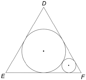O círculo C, de raio R, está inscrito no triângulo eqüilátero DEF. Um círculo de raio r está no interior do triângulo DEF e é tangente externamente a C e a dois lados do triângulo, conforme a figura.