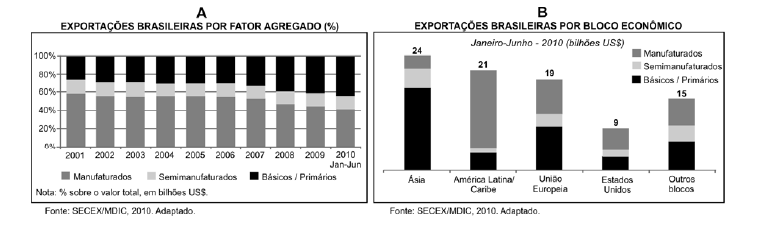 b) Compare as exportações brasileiras para a América Latina/Caribe e para a União Europeia (gráfico B). Explique as diferenças encontradas.
