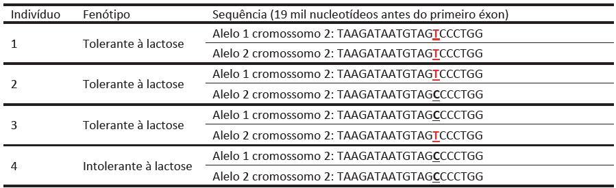b) A região codificadora dos genes é precedida e controlada por uma região regulatória. Uma mutação (C para T) na região destacada na tabela aconteceu há cerca de 10 mil anos em pessoas do norte europeu e foi conservada, resultando em manutenção da expressão do gene na idade adulta e consequente permanência da habilidade de digerir a lactose. Essa mutação aconteceu em que região do gene? Baseado nessa mutação, qual é o padrão de herança da característica “Tolerância à lactose na idade adulta”?
