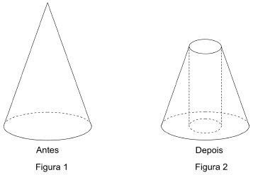 Um torneiro mecânico dispõe de uma peça de metal maciça na forma de um cone circular reto de 15 cm de altura e cuja base B tem raio 8 cm (Figura 1). Ele deverá furar o cone, a partir de sua base, usando uma broca, cujo eixo central coincide com o eixo do cone. A broca perfurará a peça até atravessá-la completamente, abrindo uma cavidade cilíndrica, de modo a obter-se o sólido da Figura 2. Se a área da base deste novo sólido é 2/3 da área de B , determine seu volume.